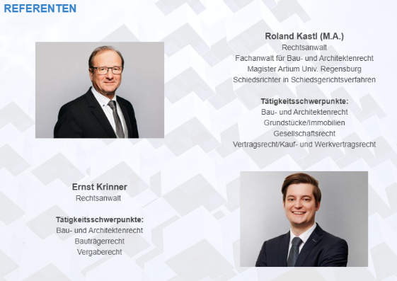 RA Roland Kastl und sein Kollege RA Ernst Krinner kennen Ihre Probleme aus der täglichen Praxis sehr genau – beide beraten seit vielen Jahren schwerpunktmäßig im Bau- und Architektenrecht, seit neuestem auch unsere Verbandsmitglieder in der kostenfreien Erstberatung.