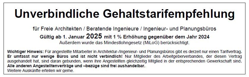 Wie immer möchten wir anschließen: Diese Gehaltstarifempfehlung ist nicht verbindlich und es kann je nach Auftragslage, Bedarf und Einkünften des Planungsbüros davon abgewichen werden.